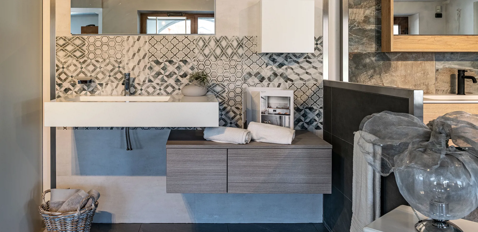 Nella nostra sala mostra puoi toccare con mano i materiali che rivestiranno i tuoi spazi. Trovi finiture per pavimenti e rivestimenti interni, insieme a una selezione di sanitari e arredo bagno.